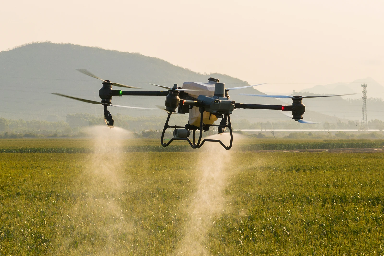 DJI T50: The T50 comes with a 50-liter liquid tank and a 70-liter hopper for granular applications. Its high-capacity centrifugal spraying system ensures even distribution, covering up to 21 hectares per hour. This makes it ideal for large farms that require high-speed, high-volume operations.